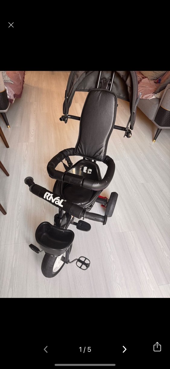 Rival marka siyah üç tekerlekli bisiklet, konforlu sırt dayanağı, güvenlik tutacakları ve güneşlikli tente içerir. Pedallı ve ön tekerlekli.