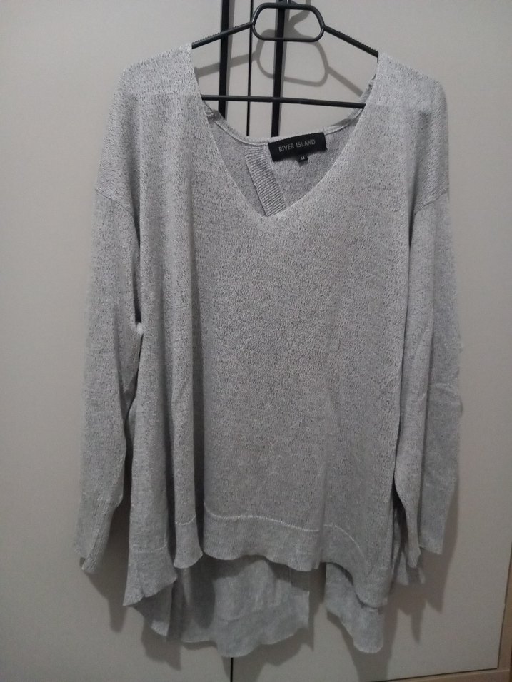 Gri renkli, V yaka, uzun kollu, bol kesim triko kazak. Yumuşak keten kumaştan, normal midi boyunda, desen içermeyen sade tasarım.