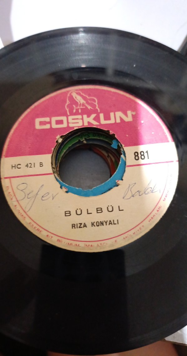 Rıza Konyalı'nın "Bülbül" şarkısını içeren, Coşkun etiketiyle basılmış 45'lik plak. Etiket pembe ve beyaz, el yazısı notlar mevcut.