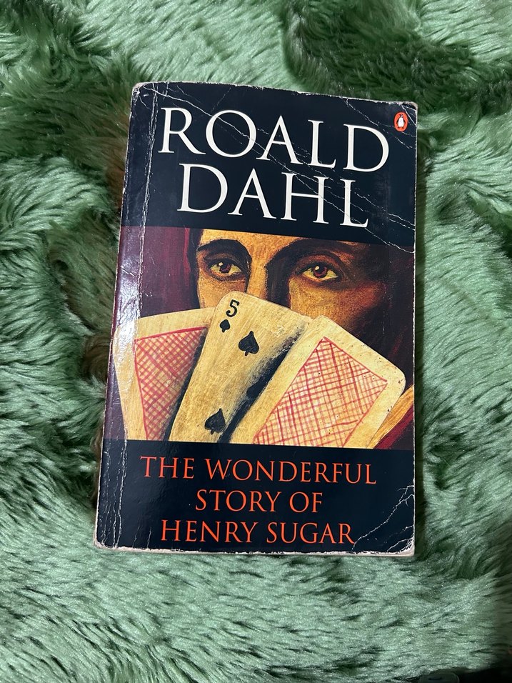 Roald Dahl'ın "Henry Sugar'nin Harika Hikayesi" adlı romanı, kartlarla kaplı ilgi çekici bir kapak sunar. Kitap, gizem ve macera temalarını işler.