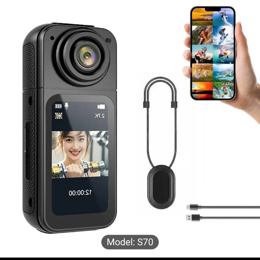 Siyah Model S70 aksiyon kamerası 2.7K video kaydı, ön ekran ve taşıma için USB kablo ile bileklik askısı içerir.