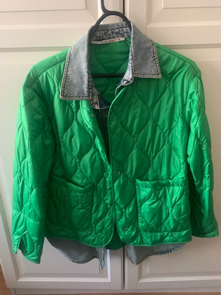 Robin kapitone kot gömlek detaylı m beden Düğmeli, parlak yeşil renkte kadın ceket. Yumuşak keten kumaştan, geniş kesim ve uzun kollu. Midi boyda, desen içermeyen günlük rahat stil için uygun.