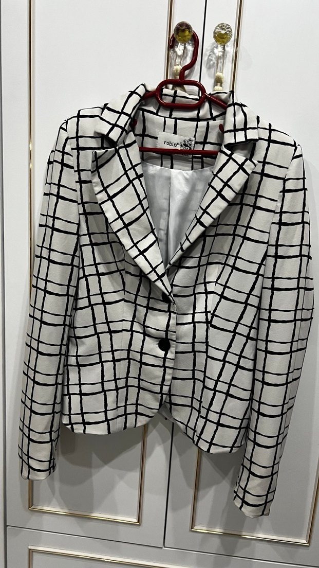 Düğmeli, kare desenli kadın blazer ceket, normal boyda ve uzun kolludur. Sentetik kumaştan yapılmış, ofis ve günlük şıklık için uygundur. Tam beyaz renk de değildir kırık beyaz gibi