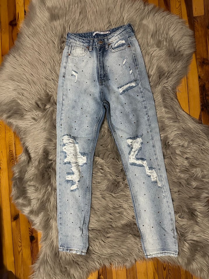 Açık mavi gri batik eskitme görünümlü ve yırtık detaylı kadın kot pantolon. Robin parlak taşlı yırtık detaylı Jean beli 30 cm boyu 99 cm bedeni 24