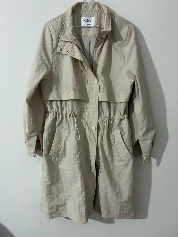 Bej keten midi trençkot, düğmeli, yakalı ve belden büzgülü, rahat kesim ile günlük şıklık sunar.