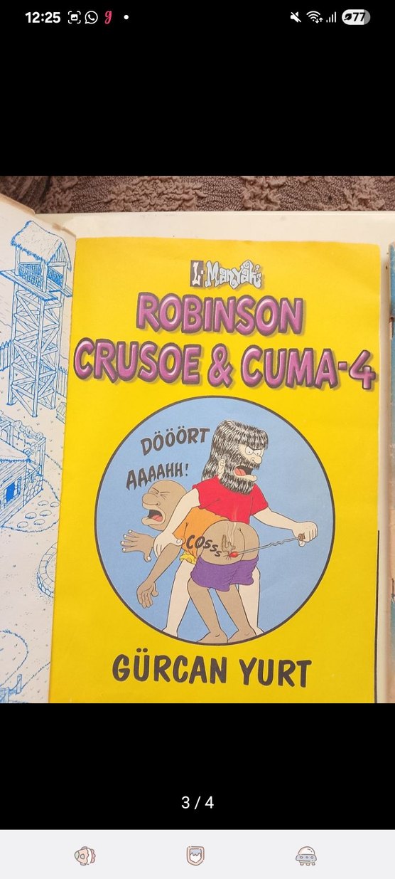 Gürcan Yurt'un çizimleriyle Robinson Crusoe & Cuma-4 mizah kitabı, eğlenceli ve komik sahneler içerir.