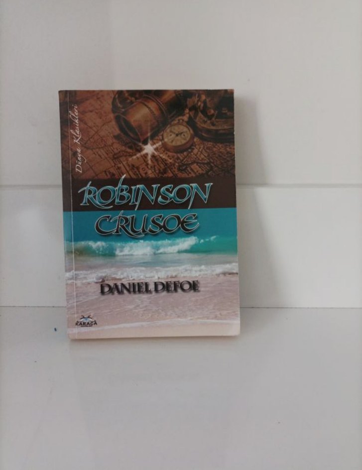 Daniel Defoe'nun Robinson Crusoe kitabı, pusula, harita ve deniz dalgalarını içeren kapak tasarımıyla macera ruhunu yansıtıyor.