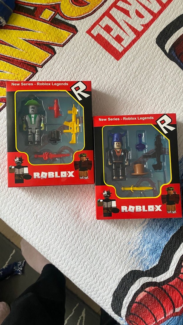 İki adet Roblox Legends aksiyon figürü, detaylı aksesuarlarla birlikte koyu ve canlı renklerde sunuluyor. Her figür silahlar ve ekipmanlar içerir. ️