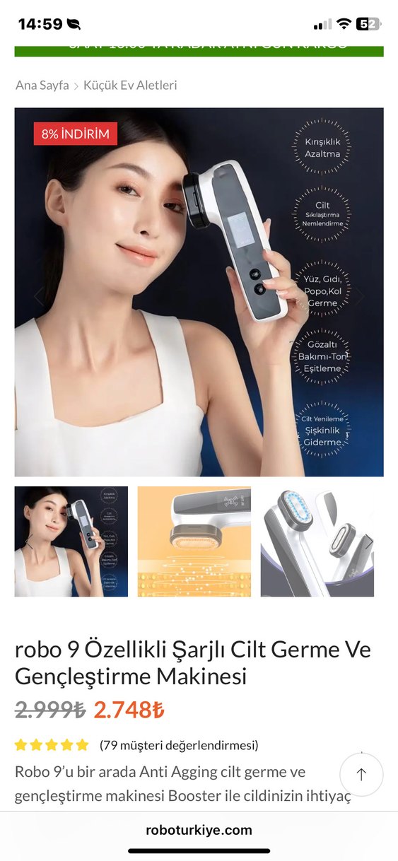 Robo 9 fonksiyonlu, şarjlı cilt sıkılaştırma ve gençleştirme cihazı. Yüz, göz çevresi ve vücut için kırışıklık azaltma ve nemlendirme sağlar.