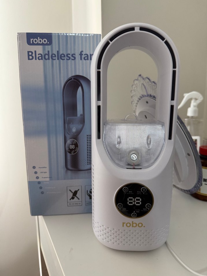 Robo beyaz kanatsız vantilatör, dijital ekran ve sessiz hava sirkülasyonu için şık kanatsız tasarıma sahiptir. Su ve buz konulabilir buhar üfler ışıklı dijital ekranlıdır