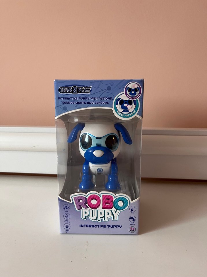 Renkli mavi Robo Puppy interaktif oyuncak köpek, sesler, ışıklar ve sensörlerle donatılmıştır.