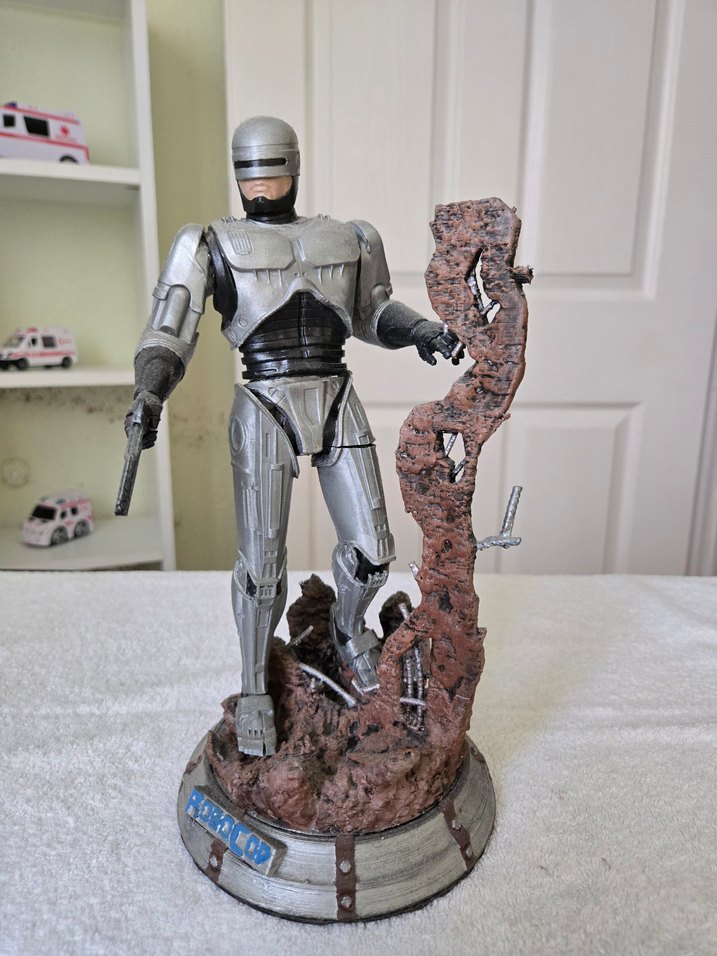 Gri renkte Robocop aksiyon figürü, detaylı bir taban üzerinde duruyor ve elinde tabanca tutuyor. Robotik zırh görünümü ve duruşu yansıtıyor.