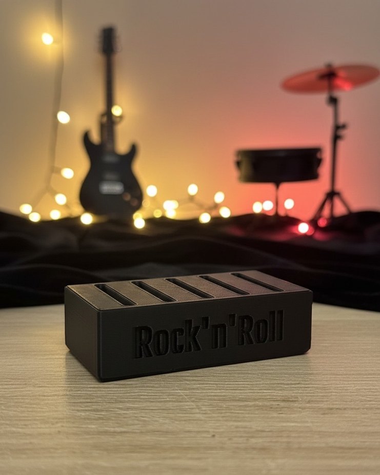 Üzerinde "Rock'n'Roll" baskısı bulunan siyah penalık. Plastik Her bir pena yeri 2.5mm Toplam 7 cm
