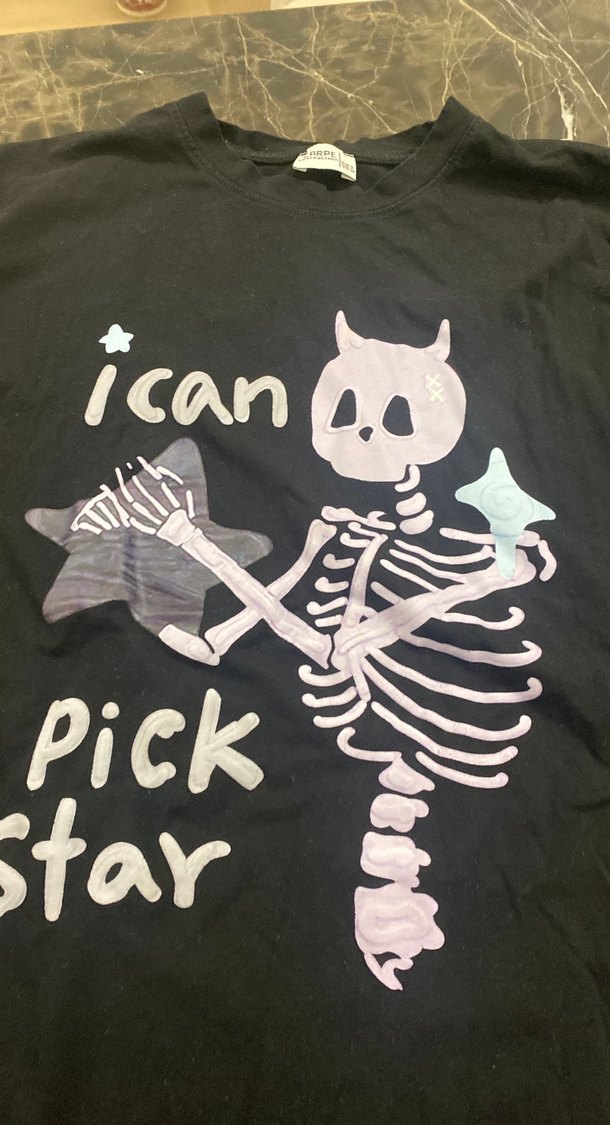 Fıt kesim gri hamile tişörtü, 'ican pick star' yazılı iskelet baskısı ile uzun kollu ve askısız yakaya sahip. Tokalı detaylarıyla parti için uygun.
