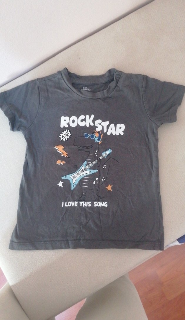Fitted kesim gri renkli erkek tişört, rock punk baskılı ve tokalı detaylıdır. Kısa kollu, bisiklet yaka modeldir. Önünde "ROCKSTAR" ve "I LOVE THIS SONG" yazıları bulunur.