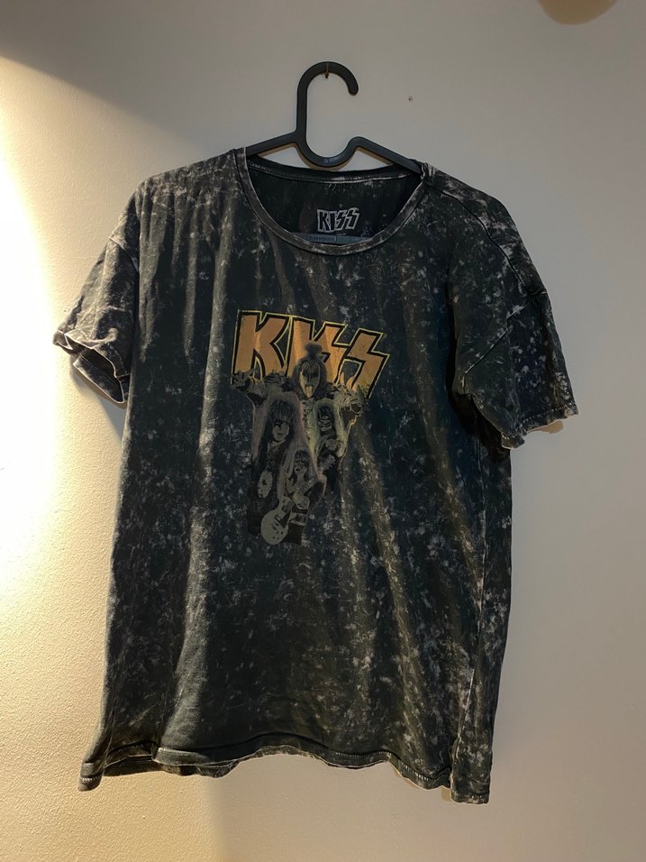Düğmeli detaylı, kısa kollu, yuvarlak yaka, siyah keten kumaştan bol kesim tişört, kiss baskılı.