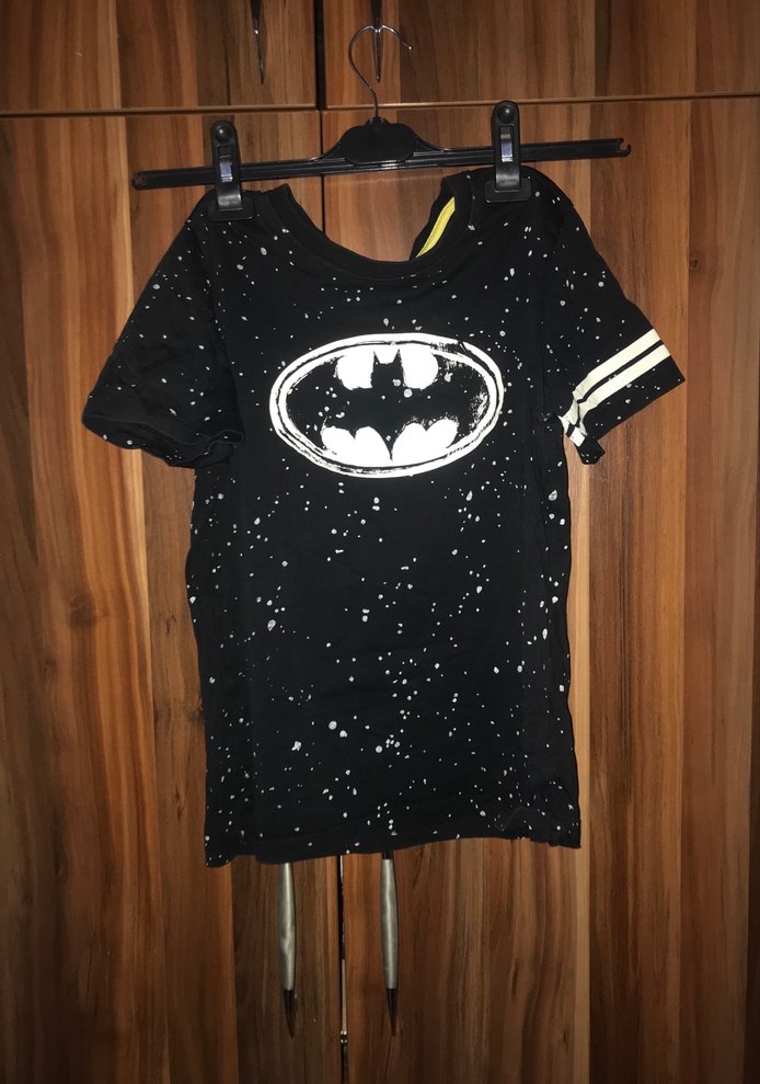 Siyah baskılı erkek çocuk tişörtü, kısa kollu, fitted kesim ve bisiklet yaka. Batman logosu ve sıçratılmış desenle, tokalı kol detayı var. Hiçbir kusuru yok . Etiketi 9-10 yaş ama 7 yaştan itibaren olabilir