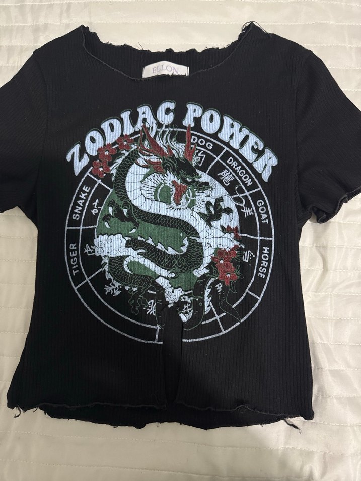 Siyah, baskılı ejderha desenli, kısa kollu, bisiklet yaka ve fermuarlı detaylı sentetik kumaş rock punk tişört. Rahat ve şık bir görünüm sunar.