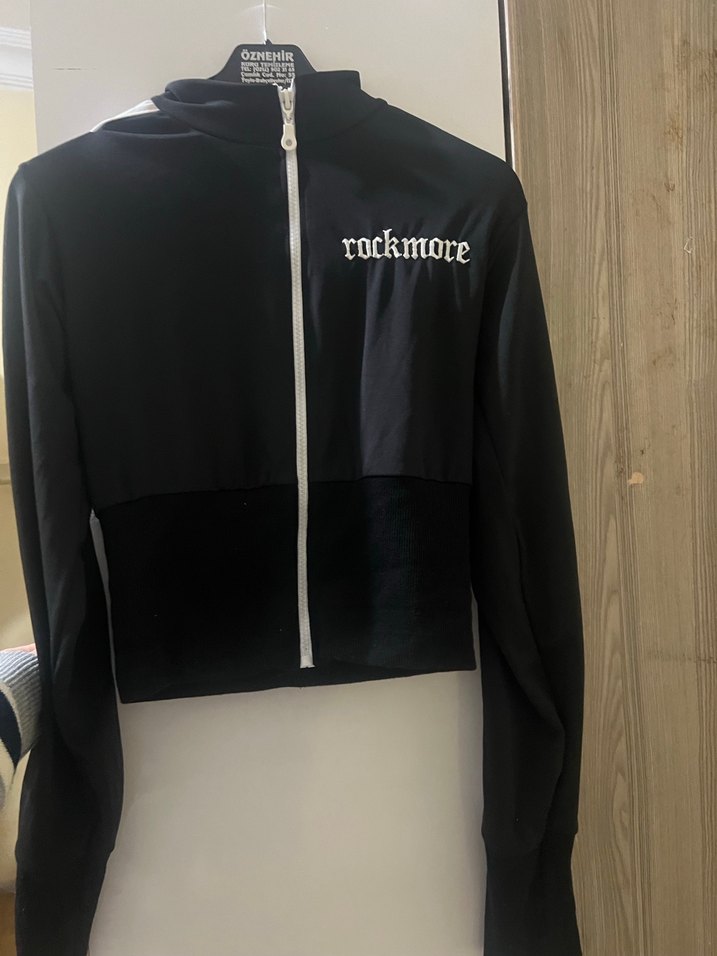 Fermuarlı, uzun kollu, siyah fitted kadın ceket. Üzerinde 'rockmore' baskısı ve yumuşak, sıcak kumaş bulunur. Günlük kullanım için uygundur.