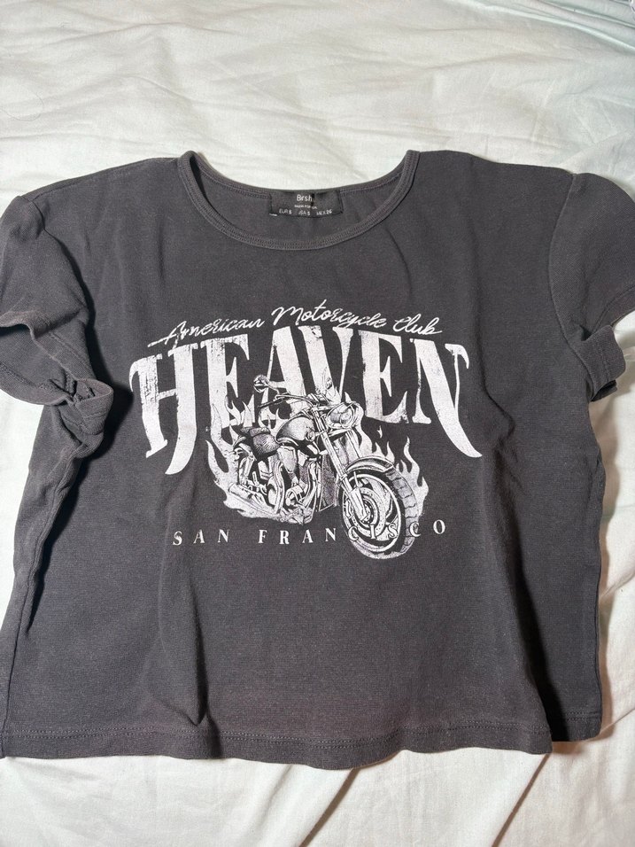 Pamuklu, gri renkli, baskılı ve kısa kollu bu fitted tişört, biker tarzında ve yuvarlak yaka. 'HEAVEN' yazısı ve motosiklet görseli bulunur rock&metal havasinda cok havali bir tisort crop