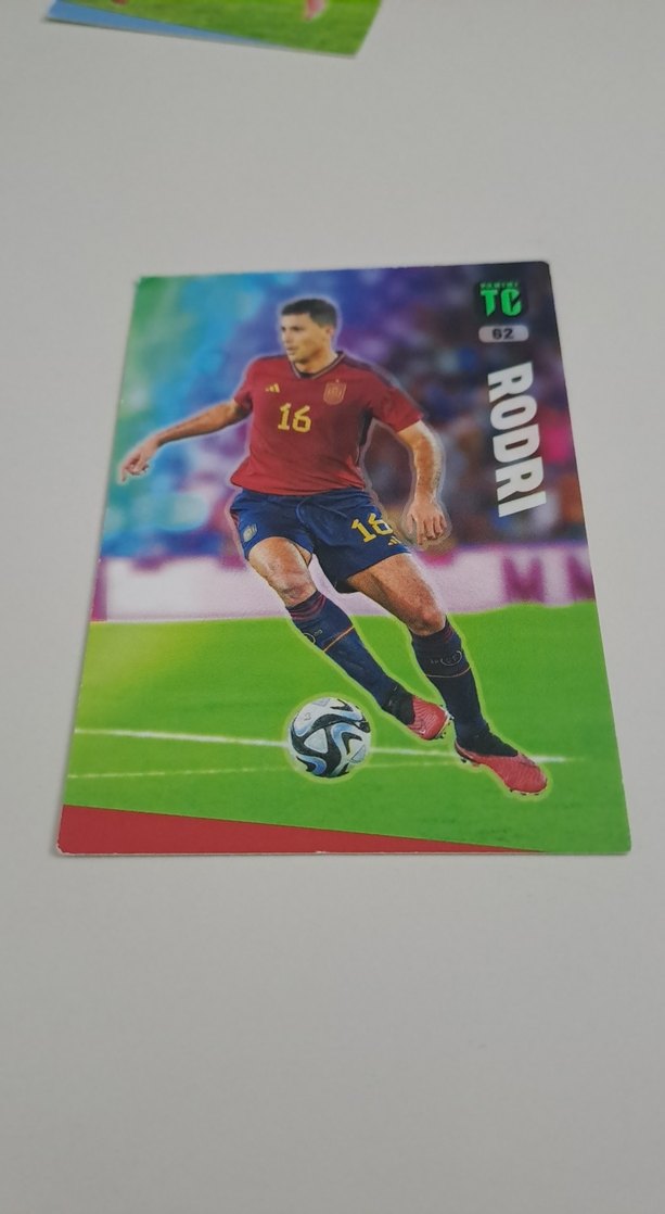 Rodri'nin 16 numaralı kırmızı formasıyla yer aldığı renkli futbol kartı, cesur pop kültürü stilini yansıtıyor. ⚽