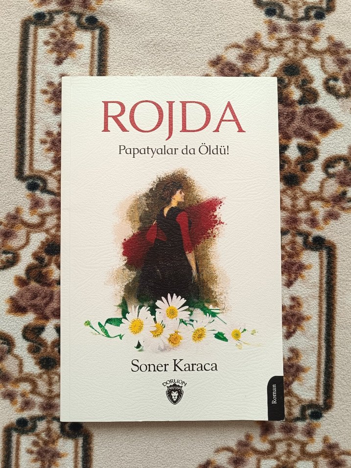Soner Karaca'nın "Rojda - Papatyalar da Öldü!" adlı romanı. Kapakta bir kadın ve papatyalar yer alıyor.