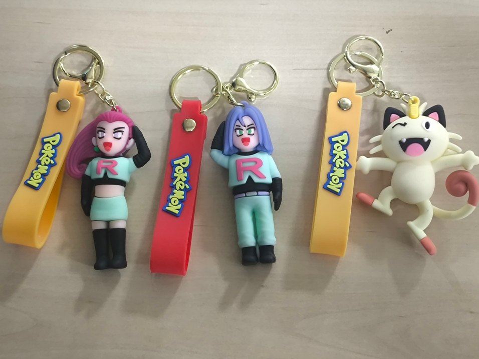 Roket Takımı Ekibi Pokemon figürleri Anahtarlık modelleri. 3 adet anahtarlık gönderilecektir. Pokemon animesinin kötü karakterlerinden olan Jessie, James ve Meowth'dan (Miyav) dan oluşan ekibin anahtarlıkları.