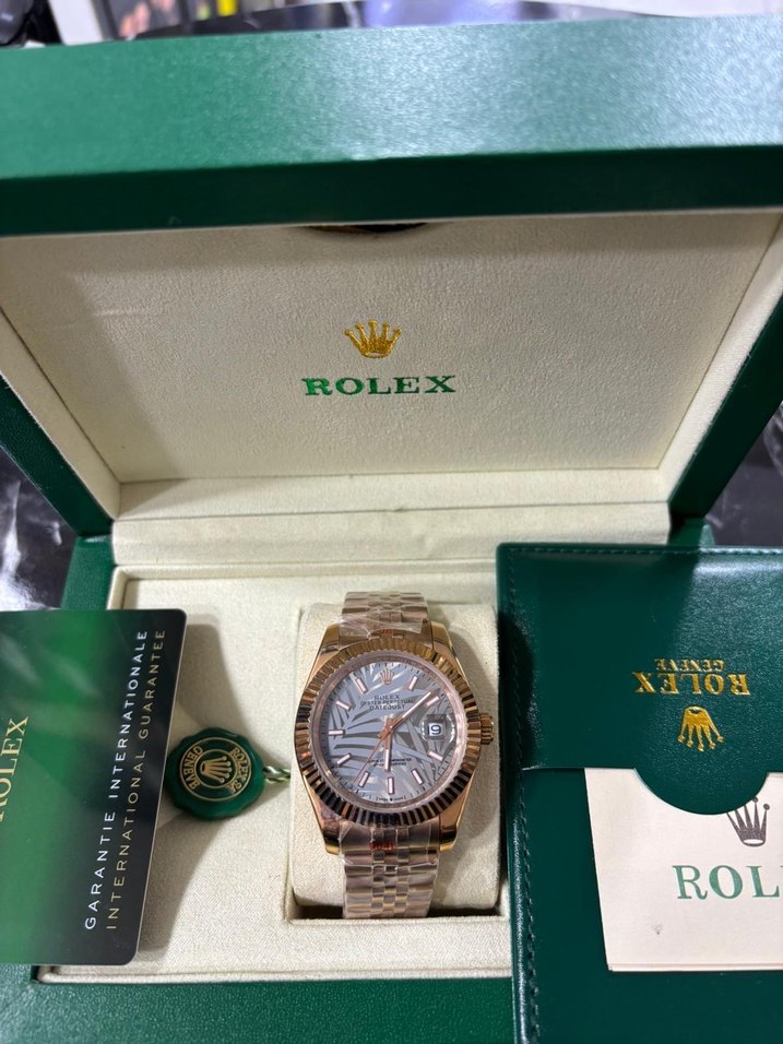 Parlak altın renkli Rolex erkek saati, çağdaş tasarımı ve iş stilini birleştiriyor. Orijinal yeşil kutusunda, garanti kartı ve aksesuarlarıyla birlikte. ⌚