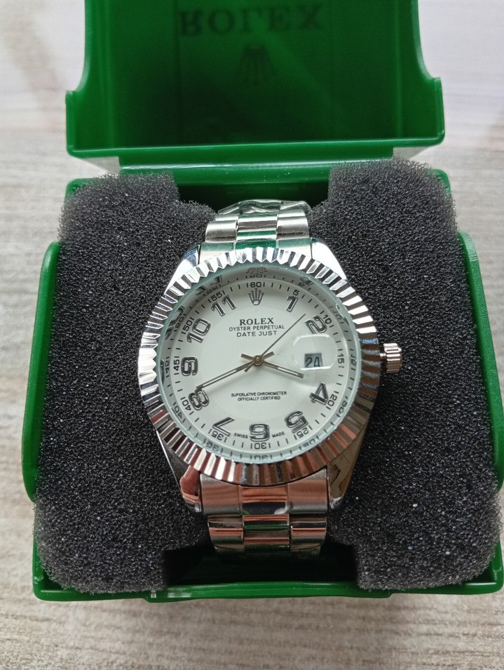 Rolex Datejust erkek saati beyaz kadran, paslanmaz çelik kayış ve tarih göstergesine sahiptir. Yeşil kutuda sunulur. ⌚