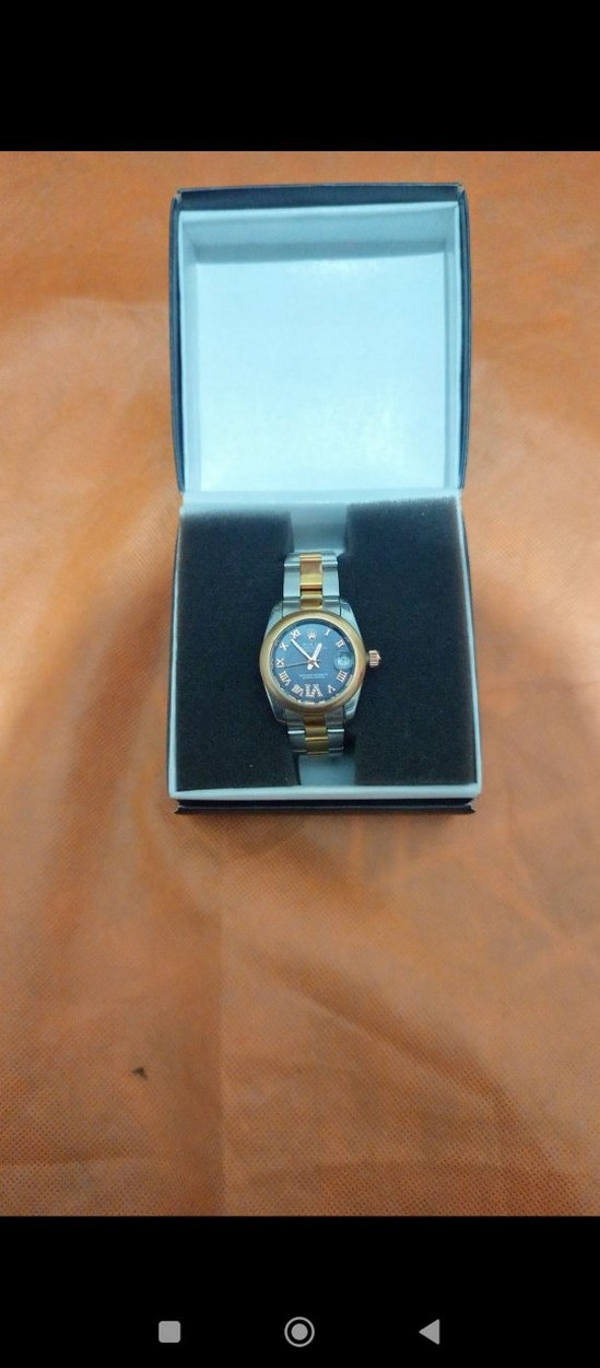 Çift renk (gümüş/gold ton) çelik kordonlu, mavi kadranlı ve Roma rakamlı şık bir saat. Tarih göstergesi ve üstünde büyüteç detayı bulunur. Klasik ve spor kombinlere çok yakışır. Öne çıkan özellikler Kadran: Mavi / Roma rakam Tarih: Var (büyüteç detaylı) Kordon: Çelik / çift renk Kasa: Gold ton çerçeveli Kullanım: Günlük / klasik / ofis Durum: Fotoğraflardaki gibi (detaylar fotoğraflarda) Kutu: Var (kutulu gönderim)