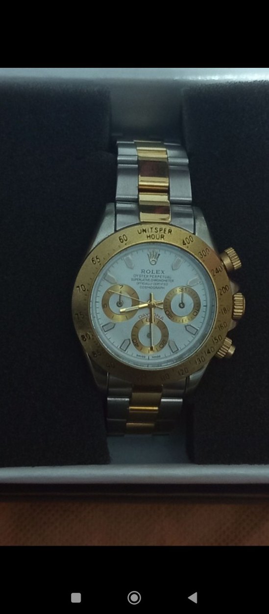 Daytona model görünümünde, iki renk (gümüş–gold) metal kordonlu, gold tachymeter bezelli şık bir saat. Beyaz kadran ve 3 alt kadran detaylarıyla hem günlük hem klasik kombinlerde çok iyi durur.