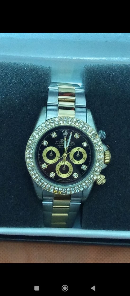 “Rolex Daytona tarzı tasarıma sahip, taşlı bezel detaylı şık saat. İki renk metal kordonu ve siyah kadran üzerindeki gold detaylarıyla oldukça gösterişli duruyor. Günlük kullanım ve kombin için ideal.