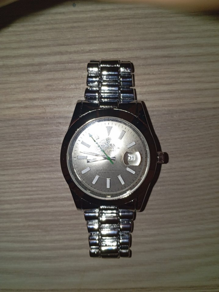 Rolex erkek saatte gri kadran, tarih göstergesi ve parlak metal bilezik bulunur; klasik ve çağdaş tasarım bir arada. ⌚ ürün kalitelidir paslanma dökülme gibi durumu yoktur.alıcısına hayırlı olsun şimdiden