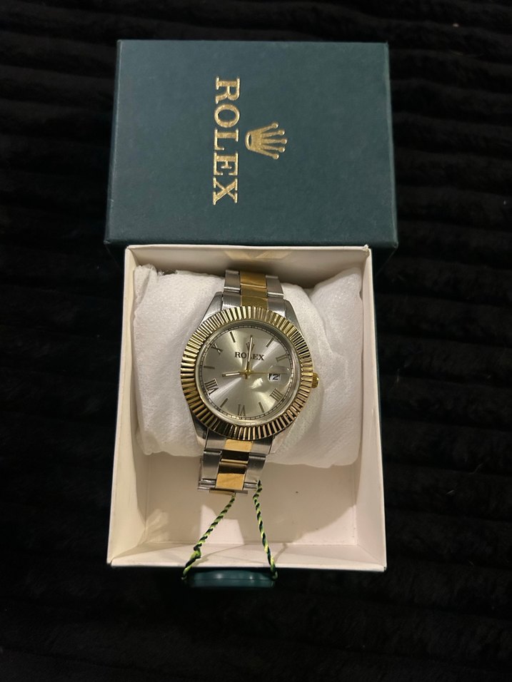 Rolex erkek saati, klasik tasarım, altın ve gri renk uyumu ile çağdaş bir stile sahiptir. ⌚