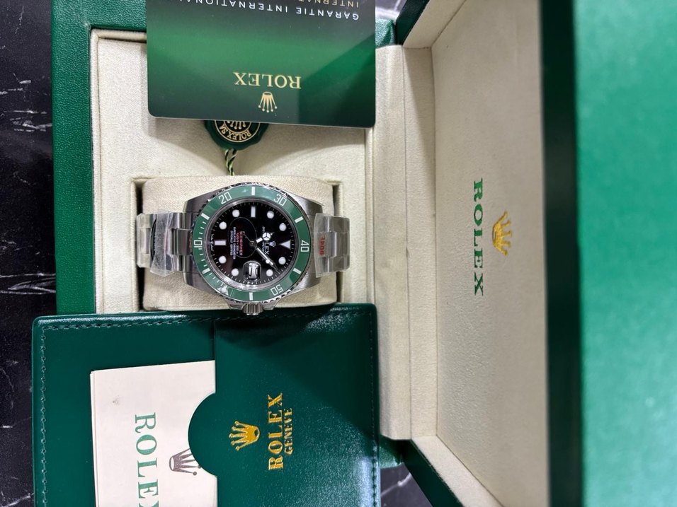 Rolex erkek saati, koyu yeşil çerçeve ve klasik tasarıma sahip. Paslanmaz çelik kayış ve siyah kadranda ışıklı göstergeler bulunur. Orijinal kutu ve sertifika ile gelir. ⌚