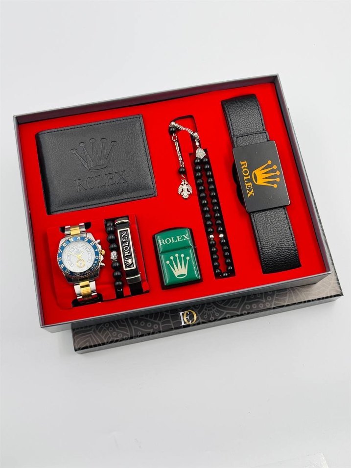Rolex siyah erkek saat, cüzdan, deri kayış, çakmak, bileklik ve tespih seti. İş hayatına uygun, sokak stiline uyumlu. ⌚