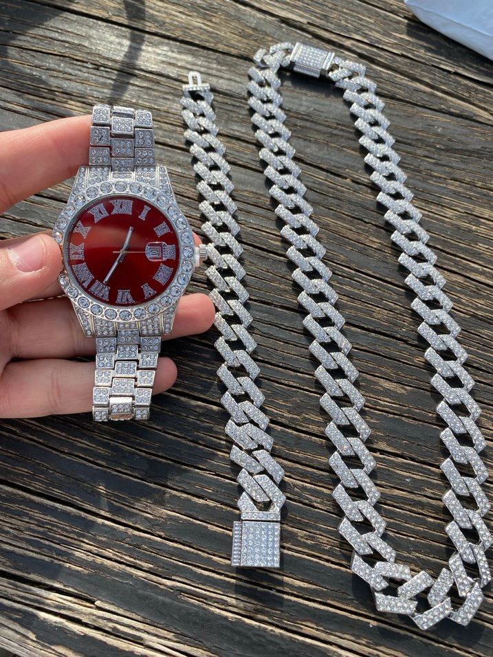 Parlak kırmızı saat kadranı ve zincir detaylı aksesuarlar içeren kadın saat ve takı seti. Sokak modasına uygun, ışıltılı yılan desenli tasarım. ⌚