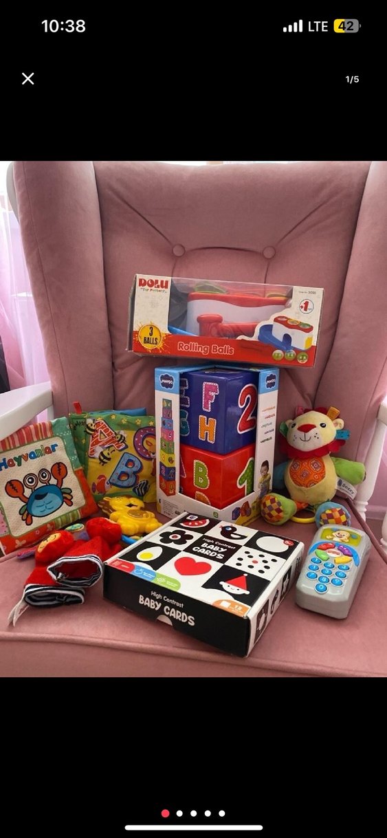 Yumuşak bloklar, peluş aslan, yuvarlanan toplar, bebek aktivite kitabı ve oyuncak uzaktan kumanda içeren renkli bebek oyuncak seti.