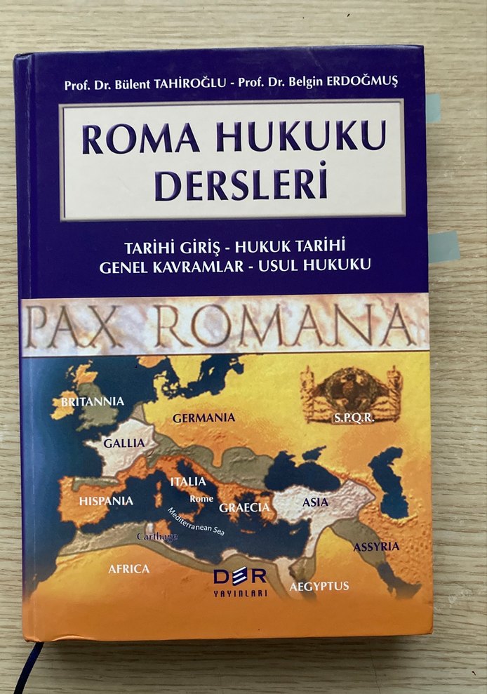 Roma hukuku dersleri, tarihi giriş, hukuk tarihi, genel kavramlar ve usul hukuku konularını içeren kitap. Prof. Dr. Bülent Tahiroğlu ve Prof. Dr. Belgin Erdoğmuş tarafından yazılmıştır. kitabın çoğu yeri çizili küçük notlar alınmış halde onun haricinde tertemiz