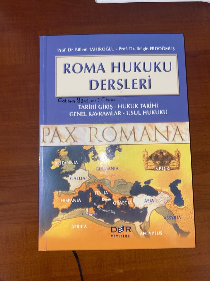Roma hukuku derslerini tarihi giriş, hukuk tarihi, genel kavramlar ve usul hukuku başlıklarıyla anlatan hukuk kitabı.