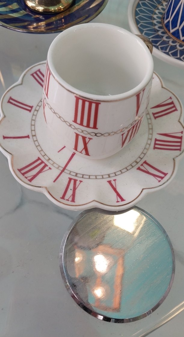 Kırmızı Roma rakamları ve IX numarası bulunan beyaz fincan ve tabak seti. Tabak dalgalı kenarlı, fincanda zincir desenli detay var. ☕6li fiyat tek fiyat 5oo tl