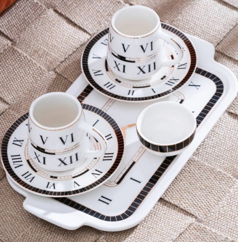 Beyaz kahve fincanları ve tabaklarında koyu Roma rakamları bulunan set. Fincan, tabak ve servis tepsisi içerir. ☕