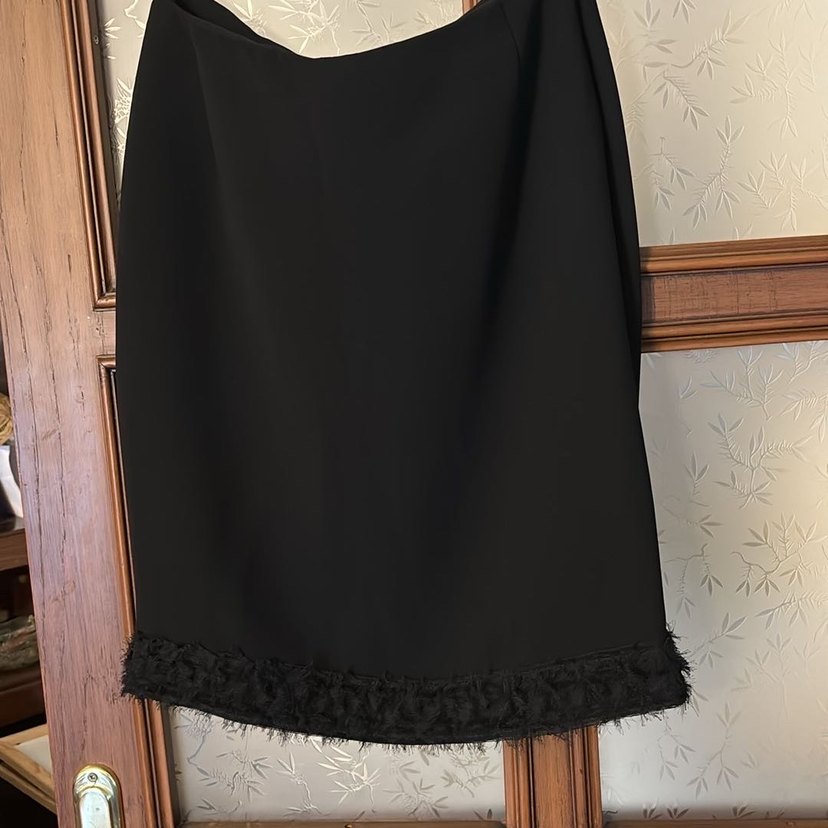 Düz siyah, uzun ve vücuda oturan etek, etek ucu volan detayına sahiptir. Sentetik kumaştan yapılmıştır ve ofis için uygundur