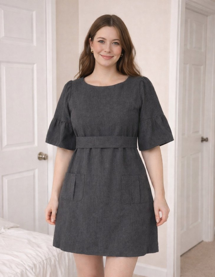 En 53cm boy 88cm kısa kollu yünlü robadan kuşaklı 2 cepli rahat elbise