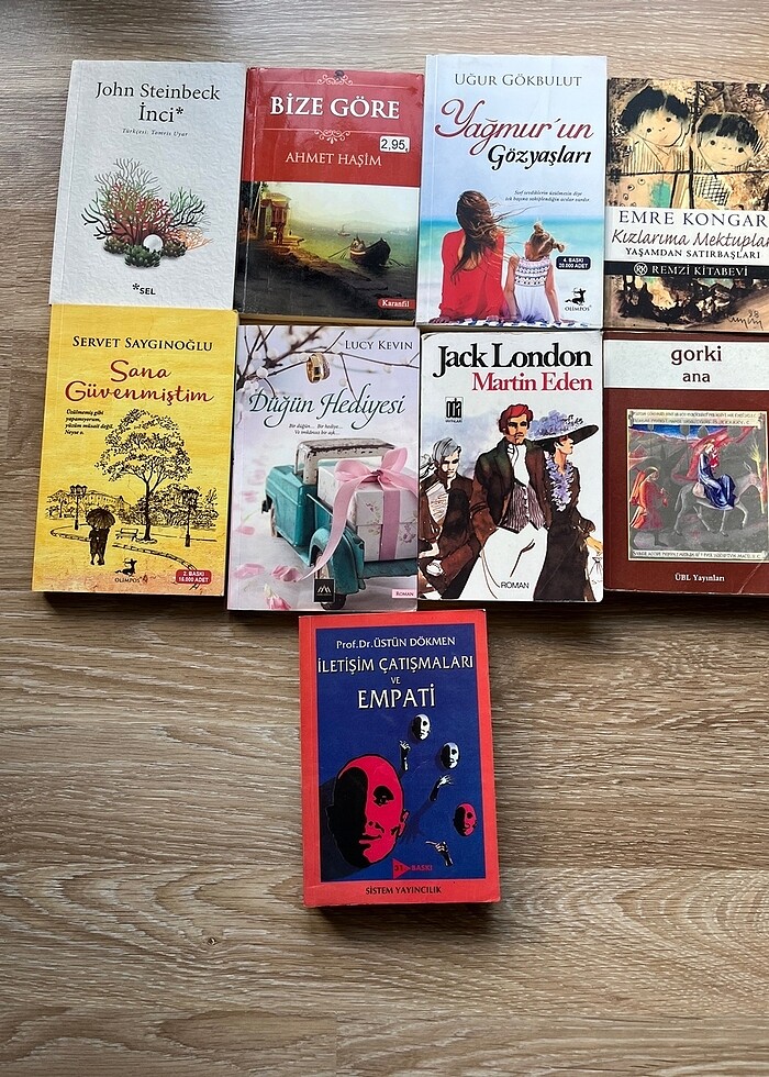 Her bir kitap ayrı ayrı satılacaktır. Lütfen mesaj atarak belirtiniz. Toplu alınmak isterseniz toplu fiyatını fiyat kısmına yazacağım. 1. John Steinbeck – İnci (Sel Yayıncılık) Fiyat: 50 TL 2. Ahmet Haşim – Bize Göre (Kazancı Yayınları) Fiyat: 40 TL 3. Uğur Gökbulut – Yağmur’un Gözyaşları Fiyat: 35 TL 4. Emre Kongar – Kızlarıma Mektuplar (Remzi Kitabevi) Fiyat: 50 TL 5. Servet Saygınoğlu – Sana Güvenmiştim Fiyat: 30 TL 6. Lucy Kevin – Düğün Hediyesi Fiyat: 40 TL 7. Jack London – Martin Eden (Oda Yayınları) Fiyat: 50 TL 8. Gorki – Ana (Öteki Yayınları) Fiyat: 40 TL 9. Üstün Dökmen – İletişim Çatışmaları ve Empati Fiyat: 50 TL