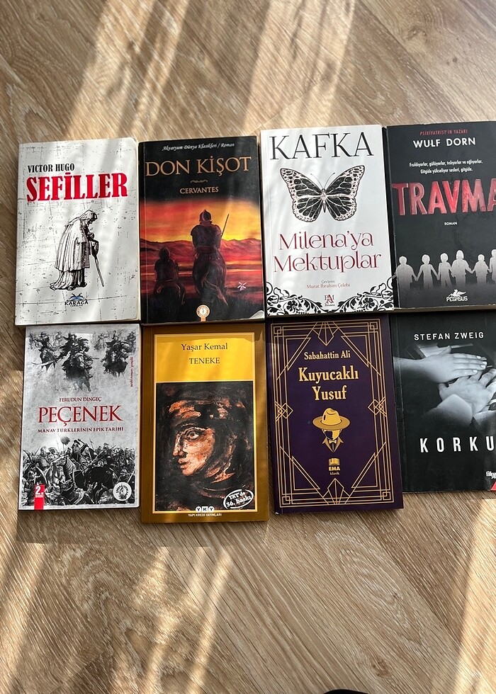 Her bir kitap ayrı ayrı satılacaktır. Lütfen mesaj atarak belirtiniz. Toplu alınmak isterseniz toplu fiyatını fiyat kısmına yazacağım. 1. Sefiller – Victor Hugo (Karaca Yayınları) fiyat: 90 TL 2. Don Kişot – Cervantes (Maviçatı Yayınları olabilir) fiyat: 70 TL 3. Milena’ya Mektuplar – Franz Kafka (Murat İbrahim Çebek çevirisi) fiyat: 50 TL 4. Travma – Wulf Dorn (Pegasus Yayınları) fiyat: 90 TL 5. Peçenek – Feridun Dirimtekin fiyat: 70 TL 6. Teneke – Yaşar Kemal (Yapı Kredi Yayınları) fiyat: 50 TL 7. Kuyucaklı Yusuf – Sabahattin Ali (EMA Yayınları) fiyat: 50 TL 8. Korku – Stefan Zweig (İlya Yayıncılık) fiyat: 30 TL