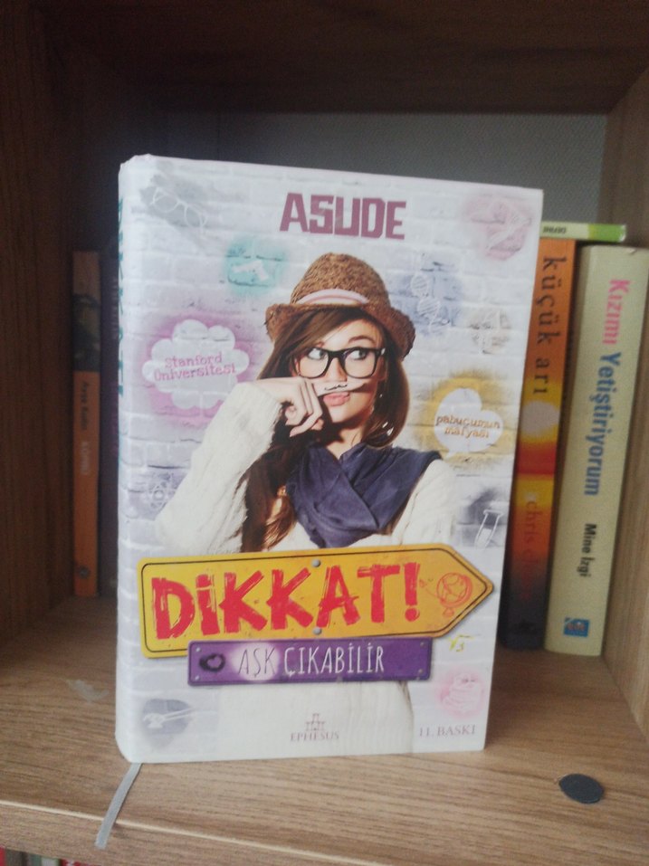 Roman kitap ciltli dikkat aşk çıkabilir Asude Stanford üniversitesi papucumun mafyası ephasus yayınları 11. Baski Asude'nin "Dikkat! Aşk Çıkabilir" romanı, gözlüklü ve şapkalı bir kızın bulunduğu eğlenceli bir kapak tasarımına sahip. Romantik ve mizahi bir hikaye anlatıyor.
