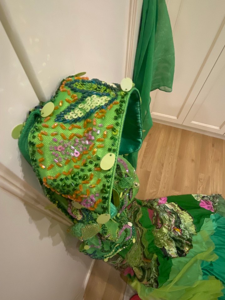 Renkli işlemeler, boncuk ve payet detaylarına sahip, uzun ve vücuda oturan yeşil elbise. Straplez yaka ve askılı kolludur, parti için uygundur.