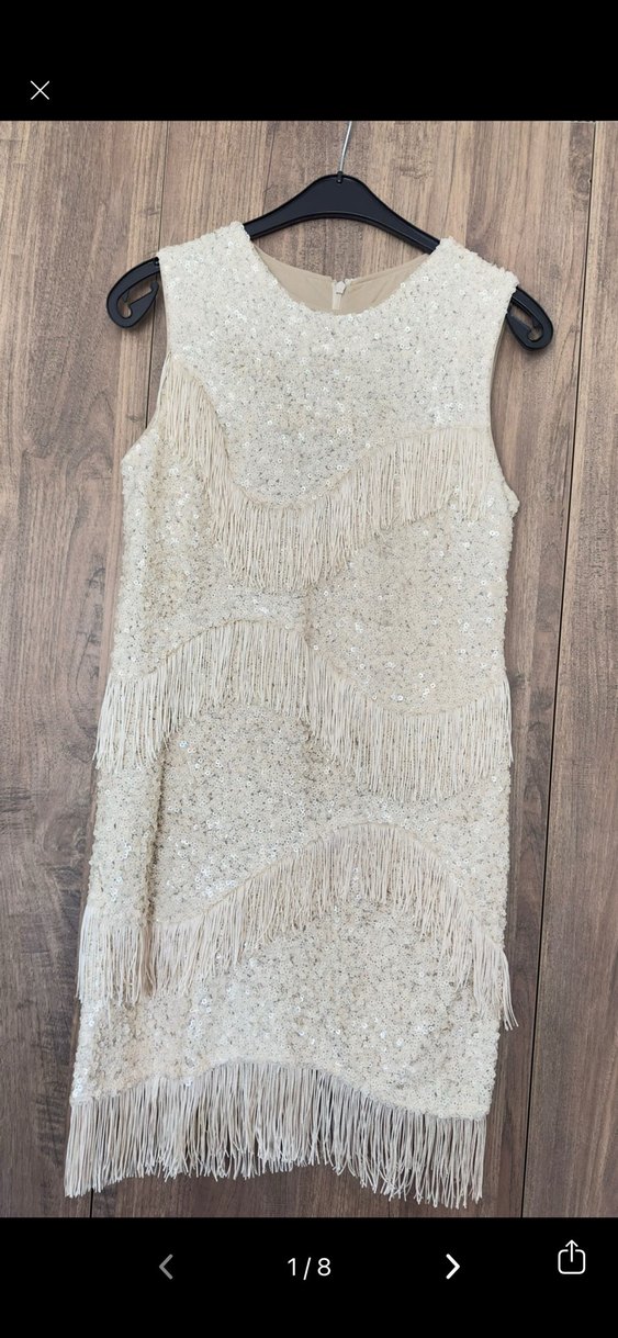 Püsküllü ve pul detaylı, kolsuz krem renk elbise. Fitted kesim , parti ve davet için uygun. İçi pamuk astarlıdır. İç göstermez. Ürün bir kez giyildi. Herhangi bir deformasyonu yoktur. Görsellere internet satış fiyatını ve duruşunu bıraktım. Ürün 42 bedendir .
