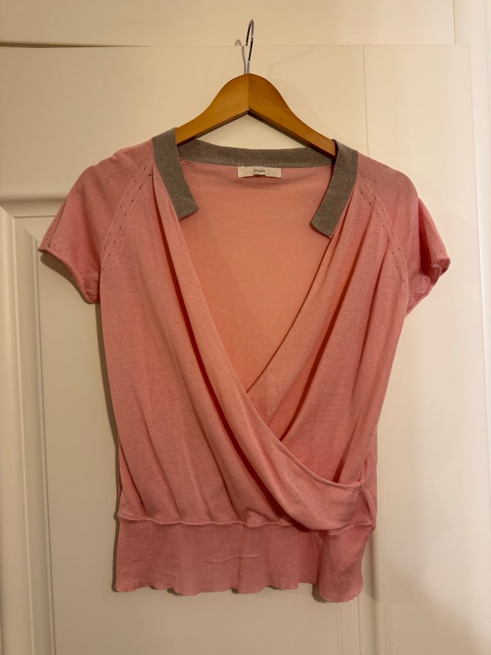 Roman marka, somon rengi, kruvaze kesim bluz. Günlük kullanım için idealdir. Şık ve rahat bir görünüm sağlar. Etiketlerini kestiğim için ölçüsü veya kumaşını net olarak söyleyemem. Ancak kumaşı ince triko. 36-38’e ve elastik olduğu için hatta 40’a uygundur.